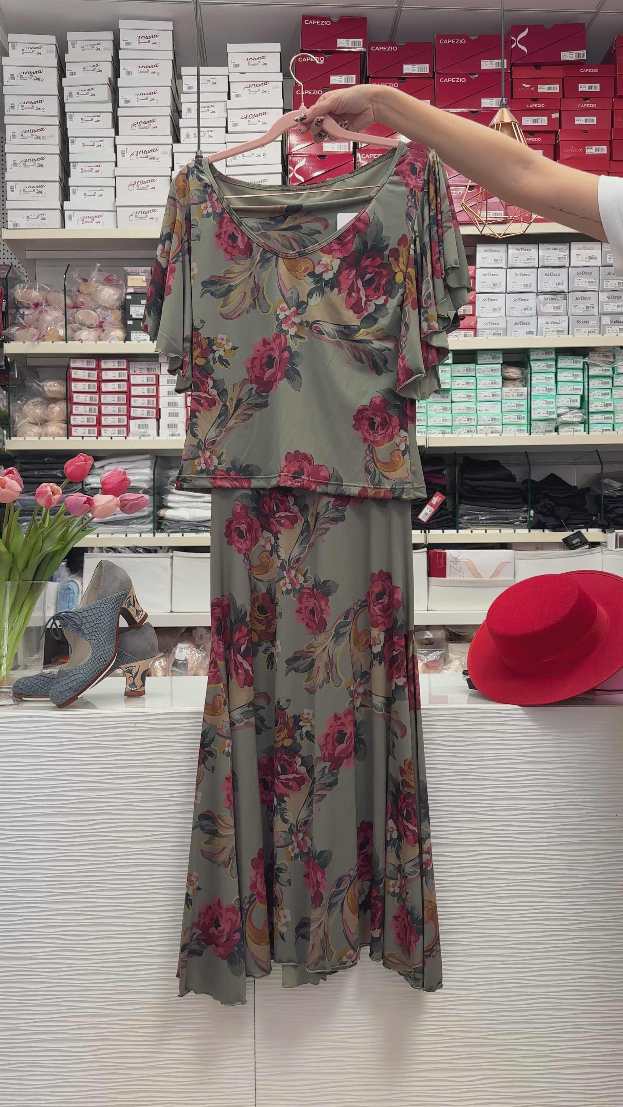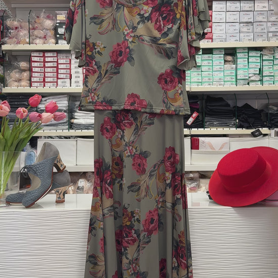 Conjunto de flamenca color verde caqui con estampado de flores. Se pueden comprar por separado.