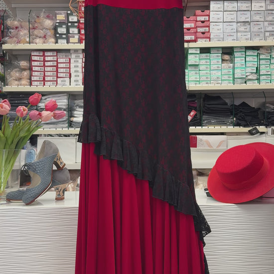 Falda flamenca roja con brodado de volantes negro.